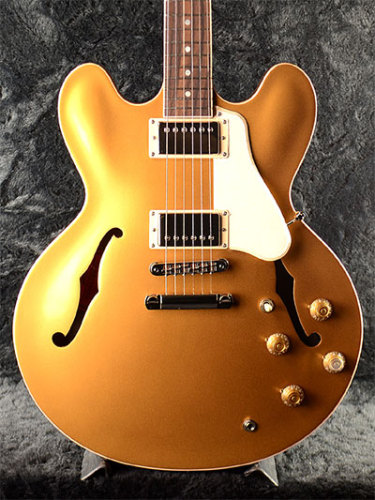 Gibson Memphis ES-335 Dot Plain Top 1958年に発表されたES-335TD。※TDとはThin(薄い)Dual(デュアルピックアップ)の略。今でこそセミアコの代名詞となっているES-335ですが、それまではセンターブロック&ダブルカッタウェイというボディスタイルのモデルは発表されておらず、非常に斬新なスタイルとして誕生したギターです。※センターブロックとは、ボディ中央を貫通するソリッドメイプル材のことです。またネックジョイントは19フレット部になっており、最終フレットまでスムースな演奏が可能。多様なジャンルのギタリストから絶大な支持を得ております。メンフィス製、2013年モデルの待望入荷です!なんといっても目を惹くのがこのカラーリング!ボディトップのみならずネックやサイド&バックもゴールドに仕上げられたインパクト大な逸品!エスカッションとピックガードをクリーム色にすることで、Les Paul Gold Topのような雰囲気も醸していて、センスの光るチョイスと言えます!定番セミアコなだけにカラー他人と差をつけたい方、ゴールドトップレスポールのとなりに置きたい方、とにかくギブソン好きな方に強力オススメです!!【送料無料】Gibson Memphis ES-335 Dot Plain Top 新品 ゴールド[ギブソンメンフィス][セミアコ][プレーントップ][金,Gold][エレキギター,Electric Guitar]価格:268,000円(税込、送料込)