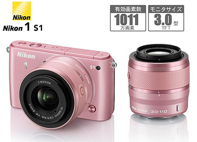 直感的な操作とレスポンスの良さで、サクサク撮って楽しめる、「Nikon 1 S1」●楽天スーパーポイント10倍&「SDカード(4GB)」プレゼント!! 「Nikon 1 S1(ピンク)」と、交換レンズ 「1 NIKKOR VR 10-30mm f/3.5-5.6(ピンク)」「1 NIKKOR VR 30-110mm f/3.8-5.6(ピンク)」の2本がセットになったキットがアウトレットコーナーへ登場です! 世界最短撮影タイムラグを実現した、Nikon 1 S1有効画素数1011万画素、圧倒的なスピードの画像処理を実現する「EXPEED 3A」を搭載し、シンプルで直感的な操作性を実現した新インターフェースを採用。“ロータリーマルチセレクター”で5つの撮影モードの選択から各設定までを簡単・スムーズに行うことができます。また、“背景ぼかし”や“動き”“明るさ”“明暗差”の表現を液晶モニターを見ながら画作りが楽しめる、「ライブコントロール」をはじめ、決定的な一瞬を逃さず捉える「スロービュー」など、多彩な機能が小型のボディーにぎゅっとつまった、レンズ交換式カメラ初心者の方におすすめです。キットレンズの「1 NIKKOR VR 10-30mm f/3.5-5.6」は、日常のスナップや風景、ポートレートなど、さまざまなシーンでお使いいただける、高い描写力を持つ標準ズームレンズです。また、「1 NIKKOR VR 30-110mm f/3.8-5.6」は、離れた被写体を撮るときに活躍する、コンパクトな望遠ズームレンズです。 キット内容Nikon 1 S1(ピンク)1 NIKKOR VR 10-30mm f/3.5-5.6(ピンク)1 NIKKOR VR 30-110mm f/3.8-5.6 (ピンク【ポイント10倍!SDカード付!】Nikon 1 S1 ダブルズームキット(ピンク)価格:39,800円(税込、送料込)
