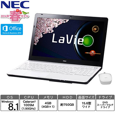 NEC 15.6型 ノートパソコン Lavie s LS150/RSは、快適に使いこなせるスリムノートです。Windows8.1を搭載して、十分な機能とスペックを持ったノートパソコンです。NEC製品ですから、安心して愛用することができます。オフィスもMicrosoft Office Home and Business 2013が付属しています。無線LANも標準装備です!【スペック】●OS:Windows 8.1 64ビット●オフィス:Microsoft Office Home and Business 2013●CPU:インテル Celeron プロセッサー 1005M 1.90GHz標準メモリー:4GB(DDR3 SDRAM/SO-DIMM 4GB×1、PC3-12800対応、デュアルチャネル対応可能) 最大メモリー:16GB メモリースロット:SO-DIMMスロット×2[空き:1]●HDD容量:約750GB(Serial ATA、5400回転/分)●搭載ドライブ:DVDスーパーマルチドライブ[DVD-R/+R 2層書込み]●モニターサイズ:15.6型ワイド●インターフェイス:■USB:USB 3.0×4■ディスプレイ:HDMI出力端子×1 ■LAN:RJ45×1●無線LAN:11nテクノロジー対応ワイヤレスLAN本体内蔵(IEEE802.11b/g/n準拠、Wi-Fi Direct準拠)●バッテリ駆動時間:【駆動時間】約3.1時間 【バッテリ充電時間】■電源ON時:約2.6時間 ■電源OFF時:約2.6時間●その他仕様:■Bluetooth テクノロジー本体内蔵(Ver.4.0) ■キーボード:106キー、テンキー付き(JIS標準配列) ■マウス:ワイヤレスレーザーマウス(横チルト機能付き) ■Webカメラ:HD解像度(720p)対応カメラ、有効画素数92万画素 ■マイク:ステレオマイク内蔵 ■スピーカ:内蔵ステレオスピーカ(2W+2W)●メモリカードスロット:SDメモリーカード(SDHCメモリーカード、SDXCメモリーカード)スロット×1 ※すべてのSDメモリーカードNEC 15.6型ワイドノートPC「LaVie S LS150/RSシリーズ」 PC-LS150RSW <ホワイト>【送料無料】価格:119,800円(税込、送料込)