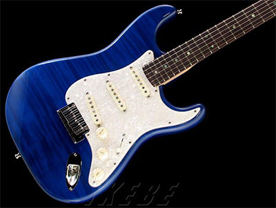 Fender USA Custom Shop IKEBE ORIGINAL Custom Deluxe Stratocaster池部楽器店オリジナルの2011年のカスタム・デラックスモデルをベースにオーダーをした極上の1本です。基本スペックは変更せず、ルックスをさらに高級感の強いスペックにてオーダー。ボディは2011 Custom Deluxe HSSモデルにて採用されていた、フレイムメイプルをボディトップに施したフレイムメイプル・トップ/アッシュ・バック構造。オーダー時にFender社に木材セレクトを依頼いたしましたが、非常に良い木材を使用していただいたと思います。バック材のアッシュも軽量な物をセレクトしていただき、バランスの良い軽量なギターに仕上がっています。ネックはフレイムメイプル・ネック/ローズ指板。ドットポジションには鮮やかなグリーンのアバロン材を使用。指板面は9.5Rの浅い仕上げにし、ジムダンロップ#6105のミッドジャンボフレットを採用することで、フレットが押さえ易く、弦高を低くしたセッティングにも音詰まりを抑えられる仕様。ネックとボディのジョイント部はヒールカットされているので、ハイポジションの演奏性に優れています。ブリッジは2点支持シンクロトレモロを使用することで滑らかなアーミングとチューニングの安定性を実現。ブロックタイプのサドルを使用することで芯のある生鳴りサウンドが特徴的です。マシンヘッドへはロック式タイプを使用することで、即座の弦交換はもちろん、チューニングの安定性と独特の弦の張りがボディ鳴りをファットにしています。ピックアップには2011年に開発されたマスターデザイン・ピックアップを3基搭載。非常にクリアで幅広いサウンドレンジに仕上がっているので、エフェクターなどの相性が良いサウンド。出力は程好くあるので、手持ちのエフェクターやアンプの特性を生かしたサウンドメイクを可能にしてくれます。ボディカラーはイケベオリジナルで作っていただいた"サファイア・ブルー・トランス"!!シースルーの青を希望したところ、Fender社によりオリジナルカラーを製作していただきました!!このカラー以外に"ピンク・トランス"&"エボニートランス"をオーダーしております。 ピックガードをシェルガードにするなど、コンポーネント的なルックスとサウンドはFenderビンテージとは違う扱いやすさとルックスを追求したモデルに仕上がりました!!!数に限りのある当店お薦めの1本をお試し下さいFender USA Custom Shop IKEBE ORIGINAL Custom Deluxe Stratocaster FMT NOS (Sapphire Blue Trans) 【特価】 【CD-ST】価格:368,000円(税込、送料込)