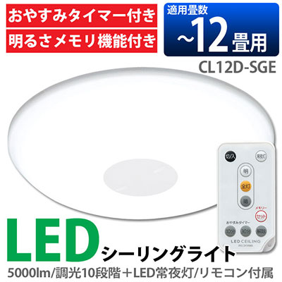 12畳用のシーリングライトが税込 7,980 円で購入可能です!ランプ寿命約40000時間!調光10段階(10%~100%)+常夜灯ランプ寿命が約40000時間と長寿命なので、約10年交換不要部屋や寝室、個室やダイニングなどに最適!コンパクトサイズなのに、従来の照明と同等の明るさ!お部屋をスッキリ明るく照らします☆色がより自然に見える演色性を実現しました♪本体の中に虫やホコリが入りにくい設計なのでお手入れも簡単です。リモコン付きで簡単操作が可能☆調光10段階(10%~100%)+常夜灯の切り替えができます。明るさメモリ機能で、お好みの明るさを記録!好みの明るさを記憶させ、記憶した明るさで再現点灯が可能♪おやすみタイマー付きで就寝時も安心♪ボタンを押してから設定した時間※がたつと徐々に消灯する機能です。おやすみ時の消し忘れ防止に役立ちます! ※10分、30分工事不要で簡単取り付け♪今お使いのシーリングからの付け替えが簡単です。付属アダプターを使用して簡単に取付けができます。≪SALE!≫【送料無料】《コンパクトなサイズ》 LEDシーリングライト 【12畳対応】 CL12D-SGE アイリスオーヤマ【5000lm/10段階調光/リモコン/常夜灯/明るさメモリ/おやすみタイマー付】【1129ap_ho】【10P11Jan14】【RCP】価格:7,980円(税込、送料込)