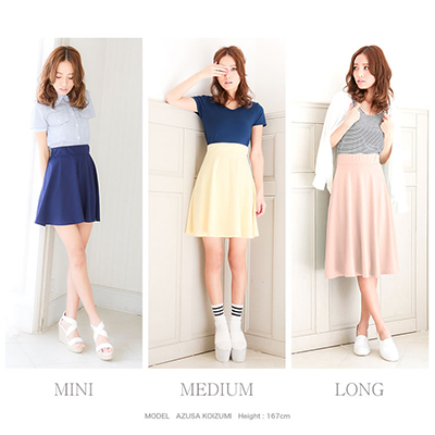 3つの長さから選べる!! 大人気のフレアスカートに2014年秋の新色が登場です。カジュアルな印象のミニ丈から、上品なミディアム丈や 秋冬のコーデに大活躍なロング丈まで、スタイルに合わせてお好みの長さがチョイスできます♪ストレッチの効いたポンチ生地を使用して落ち感を生み出し滑らかなドレープがエレガントな印象を与えるスカートです。ウエストゴム入りなので穿き心地もらくらくでトップスのINもしやすく、デイリーにも大活躍間違いなし!豊富なカラーバリエーションでコーデの幅がグッと広がる1枚です。待望の2014F/Wカラー追加!【1290円×送料無料(ミニ丈&ミディアム丈はメール便送料無料)★秋新作】ウエストゴム ミニ丈 ミディアム丈 ロング丈 フレア スカートレディース[一部予約]【返品交換不可】価格:1,290円(税込、送料込)