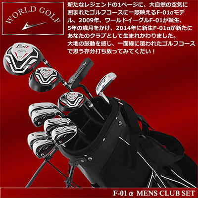新たなレジェンドの1ページに、大自然の空気に囲まれたゴルフコースに一際映える!F-01αモデル、2009年、ワールドイーグルF-01が誕生、5年の歳月をかけ、2014年に新生F-01αが新たにあなたのクラブとして生まれかわりました。大地の鼓動を感じ、一面緑に覆われたゴルフコースで思う存分打ち放ってみてくだい!新たなレジェンドの1ページに、大自然の空気に囲まれたゴルフコースに一際映える F-01αモデル、2009年、ワールドイーグルF-01が誕生、5年の歳月をかけ、2014年に新生F-01αが新たにあなたのクラブとして生まれかわりました。 大地の鼓動を感じ、一面緑に覆われたゴルフコースで思う存分打ち放ってみてくだい!WOOD : #1 #3UT : 24IRON : #6 #7 #8 #9 PW SWCHIPPER : F-01α 2Way CHIPPERPUTTER : 専用パターBAG :専用スタンド式バックウッド2本、UTウッド1本、アイアン6本、 チッパー、パター、バック、ウッド用ヘッドカバー2点の合計14点セット!! ※右利き用です ワールドイーグル F-01α メンズ14点ゴルフクラブセットフレックスR /S 【右用】【WORLD EAGLE】【初心者 初級者 ビギナー】【ポイント2倍】【期間限定】【最安値に挑戦】【あす楽】【RCP】【02P22Jul14】価格:26,784円(税込、送料別)
