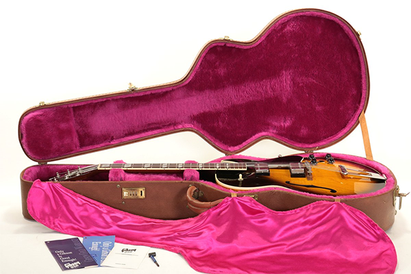 ◆アーチトップ・ラミネート・ボディの定番ジャズ・ボックス、ES-175。フローレンタイン・カッタウェイのメイプル・アーチトップ/サイド/バック、マホガニー・ネック、ミディアムスケールのローズ指板、ブリッジをローズ・ブリッジベース上にマウント。ピックアップはGibson製ハムバッカーを2基搭載したデュアル・ピックアップ仕様。