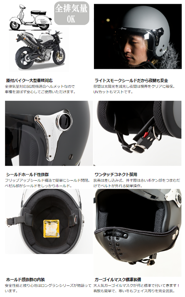 ●クラス最小スタイル ジェットヘルメットでありがちな不格好な頭でっかちにならないスモールジェット帽体でありながらサイズはフリー(57cm~60cm)とうれしい設定になっています。