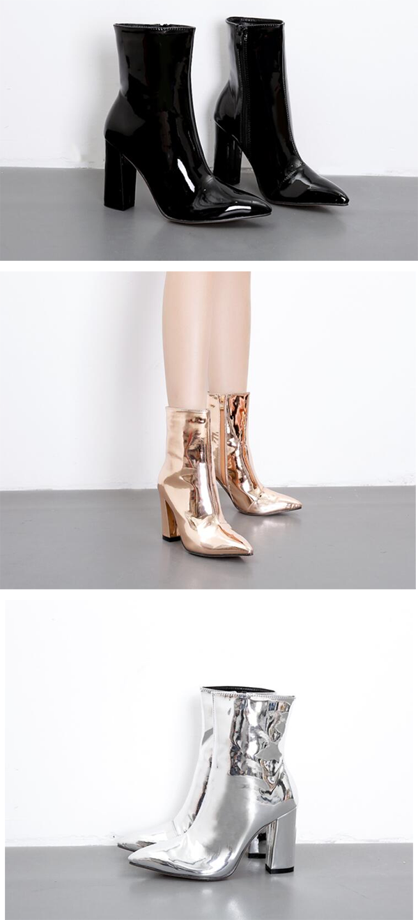 ◆チャンキーヒール9cmのレディースエナメルショートブーツです。