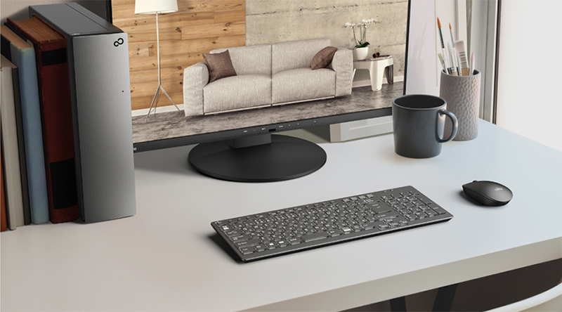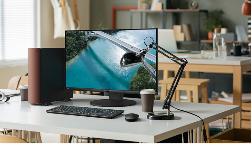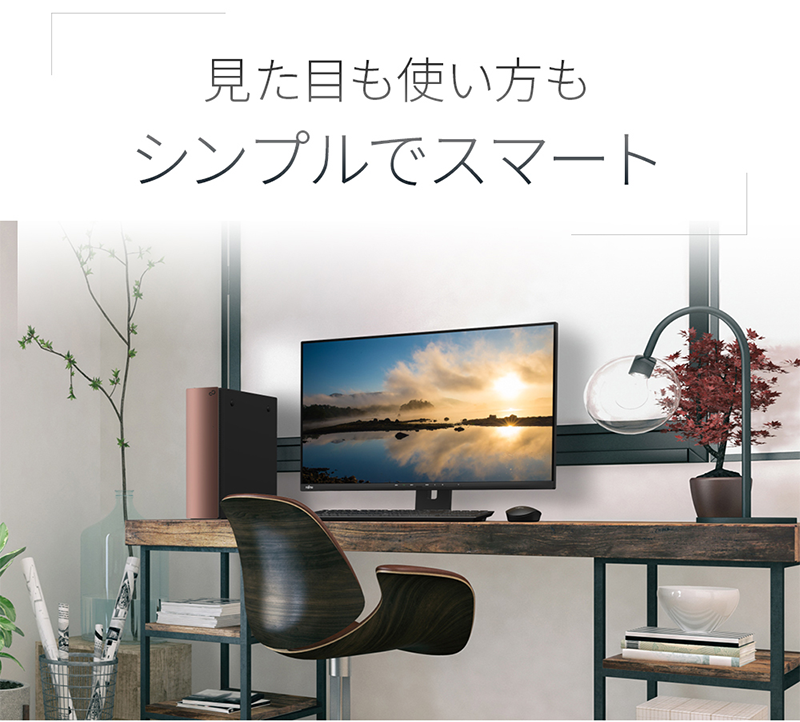 インテリアにマッチするシンプルなデザイン。I/Oや吸排気口によって煩雑になってしまいがちな本体正面部には、さっと開け閉めができるドアタイプの全面カバーを採用。使い勝手とデザイン性を両立しています。キーボードからの電源ON機能にも対応し、見た目も使い方もスマートになりました。