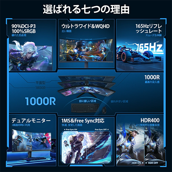 【公式ショップ限定POINT5倍】KOORUIゲーミングモニター モニター ウルトラワイドモニター 曲面モニター 1000R 34インチ UWQHD3440*1440 ★165Hz 湾曲ゲーミングモニター ゲームモニター HDR400 1ms VAパネル ps4/ps5/switch対応 価格:39,980円(税込、送料無料) (2025/2/26時点)