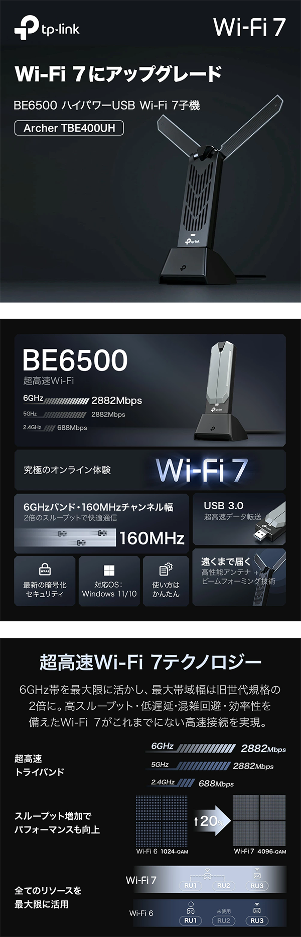 ▶ Amazonのサイト: TP-Link WiFi 7 無線LAN 子機 BE6500規格 【 2882Mbps(6GHz) + 2882Mbps(5GHz) + 688Mbps(2.4GHz)】 160MHz WPA3 USB3.0 Windows 11