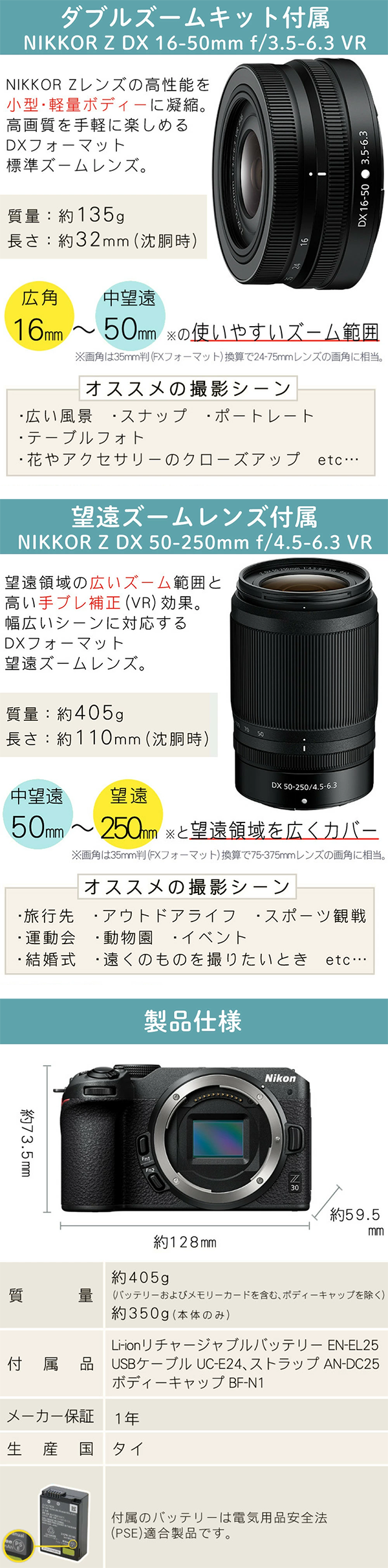 ●付属レンズ ・標準ズームレンズ「NIKKOR Z DX 16-50mm f/3.5-6.3 VR」 ・望遠ズームレンズ「NIKKOR Z DX 50-250mm f/4.5-6.3 VR」