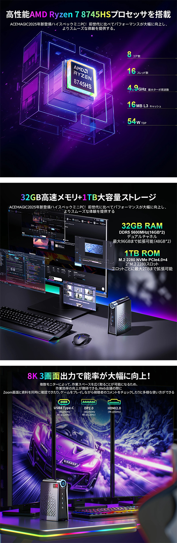 • CPU AMD Ryzen 7 8745HS (8コア/16スレッド、最大4.9GHz)