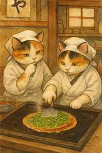 お好み焼きの先輩みたいなものだにゃ。鉄板に、水で溶いた小麦粉を薄く、べたっと広げるにゃ。