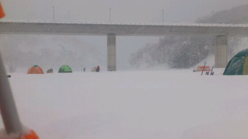 今回は横川ダムへ~ ちょっと吹雪いてるがポツポツとテントが見える(((・・;) 早速…