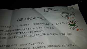 新年早々、素晴らしいご報告をいただきました。なんと・・・宝くじで高額当選されたそうです! 「オーラのパワーアップ秘法講座」を受講された女性の方です。なかなかお目にかかれない高額当選者に渡される書類の画像を送ってもらいました。 下記に掲載させていただきます。 今回の「福袋」キャンペーンでは「秘法講座」「SP講座」も2万円割引価格で受講できます。 「福袋」キャンペーンに付いては下記ページをご覧ください。●●今月のランキング・キャンペーンのページ!(「福袋」キャンペーンの情報はこのページをご覧ください) 「運気アップグッズ」については、下記ページをご覧ください。●●●最新グッズのページ!「キラキラダイアモンドカットパワーグッズ」「セレブパワービーム・コンパクト」「金運アップボールペン」「Wパワーサンキャッチャー」「ウルトラパワーサンキャッチャー」「パワークッション」「セレブパワーファン」」(「ウルトラパワー水」「運気アップパワーボールペン」