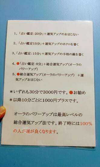 初めてご相談に来られた方のために「占いメニュー表」というものを作っています。 先日、テレビの放送で「ホクロ占い」をしたので、それを希望される方も来られるようになったので・・・「ホクロ占い」を追加した「占いメニュー表」を更新しました。 「ホクロ占い」を希望される方は、お気軽にお越しください。ちなみに「ホクロ占い」の真骨頂である「ホクロを書いて運気アップ」は「15秒で金運アップ秘法講座」でその内容が分かります。 占いを始めようとする方には、最適なプラスの業務となります。もちろん、現役の占い師さんにも強力なプラスの業務となります。 「15秒で金運アップ秘法講座」は、誰でも受講できます。 現在「福袋」キャンペーンで「秘法講座」「SP講座」は2万円割引の受講料となっています。「15秒で金運アップ秘法講座」は39800円ですので19800円となります。 初めて「秘法講座」を受講される方のみ入会金5000円が必要です。 「15秒で金運アップ秘法講座」や最新の「高次元運気アップ空間作製秘法講座」「パワースポット構築SP講座」や「ウルトラパワーアップ秘法講座」「オーラのパワーアップ秘法講座」各秘法講座、SP講座の受講申し込みは下記ページをご覧ください。そして現在、14種類の「秘法講座」2種類の「SP講座」のどれかを受講された方には、受講料が2万円割引価格となります。●●●占いスクール・秘法講座・体験談のページ!「15秒で金運アップ秘法講座」高次元運気アップ空間作製秘法講座、パワースポット構築SP講座、オーラのパワーアップ秘法講座、ウルトラパワーアップ秘法講座、トリプルパワーアップ+1・秘法講座、パワー水作製秘法講座、運気アップパワー注入SP講座、福の神招来!秘法講座、邪気祓い&浄化パワーアップ!秘法講座、奇跡の開運!W秘法講座、その他の占い講座、秘法講座・体験談」の情報はこのページをご覧下さい現在開催中の「福袋」キャンペーンの詳細は、下記ページをご覧ください。●●今月のランキング・キャンペーンのページ!(「福袋」キャンペーンの情報はこのページをご覧ください) 画像は新しくなった「占いメニュー表」です。