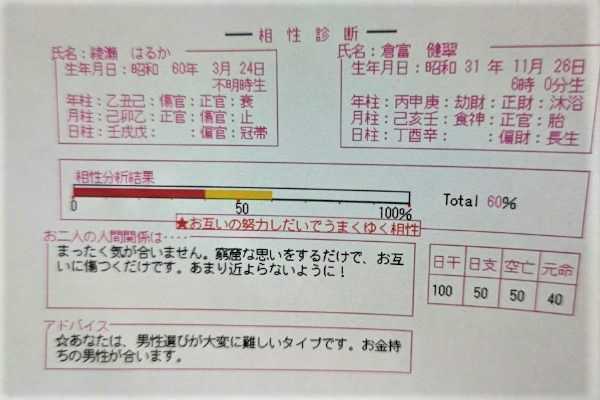 先日のブログで紹介した「相性度合いを%で鑑定診断した書類」です。