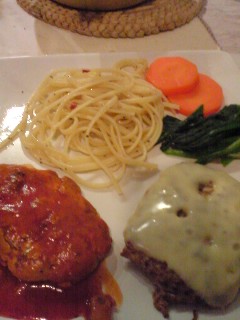 結構美味しい、私のハンバーグ・・・。普通ですが、何かなんかレイアウト変だけど煮込みとチーズで、なんとなくフルーツたっぷりデザーツくんだりーに