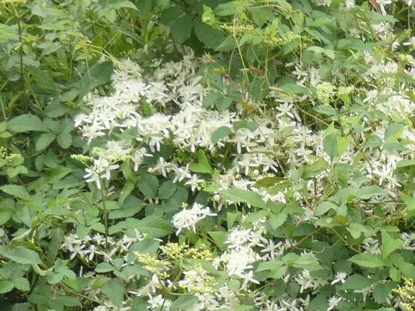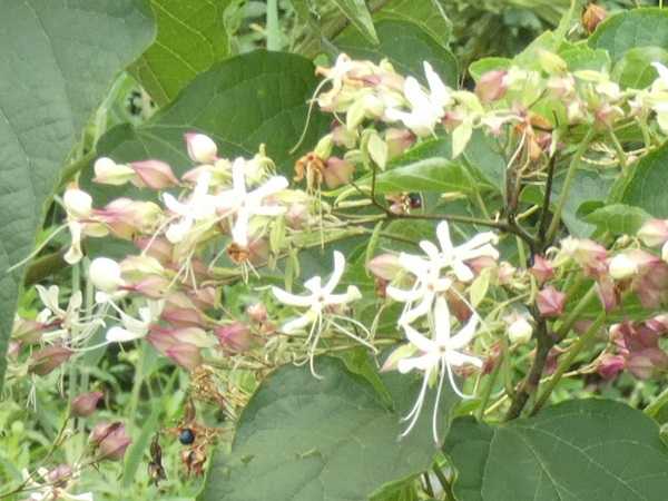 神社から川岸に出ると民家の植え込みにクサギが面白い形の花を咲かせている