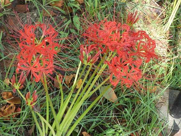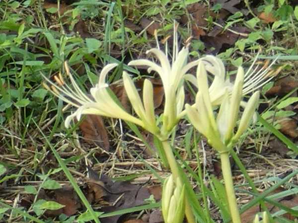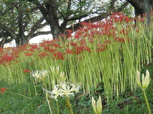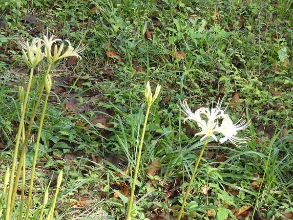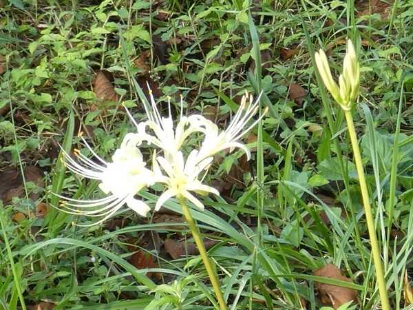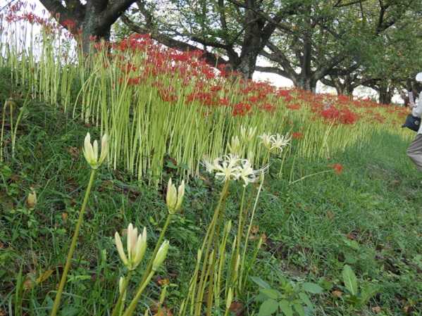 桜堤まで来るこの一か所にだけ白い彼岸花があり赤い花より少し遅れやっと開花し始めました