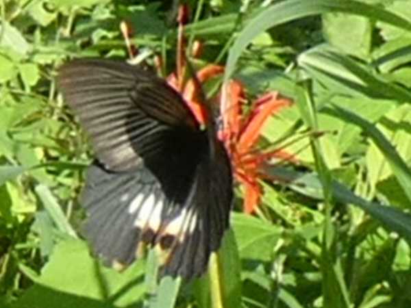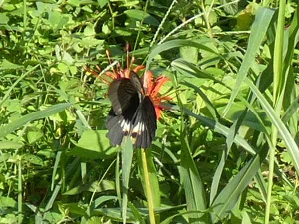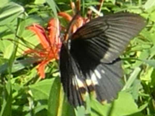彼岸花が咲き出し開花が進むと必ずやってくるカラスアゲハ、花から花え飛び回り蜜を吸っている