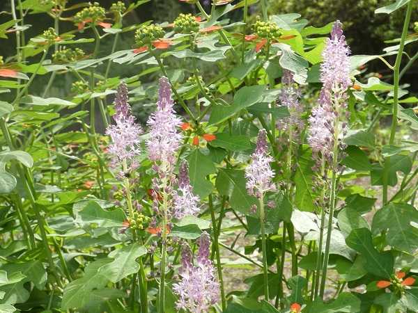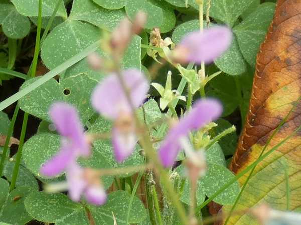 民家の庭先で咲いていたツルボ、脇には猩々草が葉を赤く染めていた。ツルボは返り咲きかな?