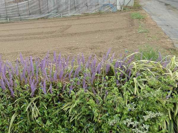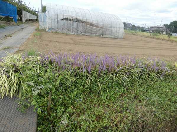 畑の端にうえられたヤブランが咲き出しているがこれも返り咲きかな?春先にも咲いてたなー