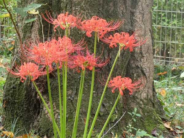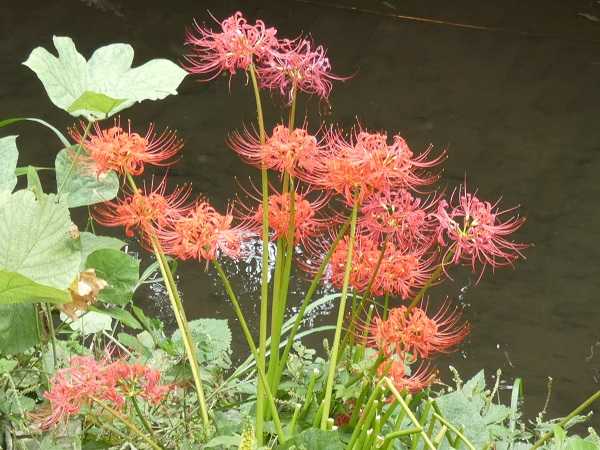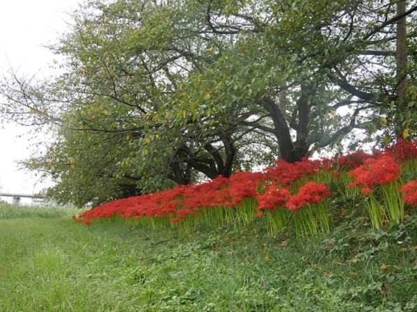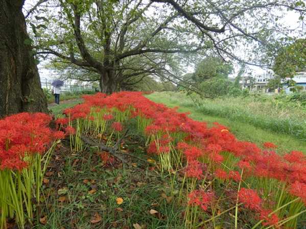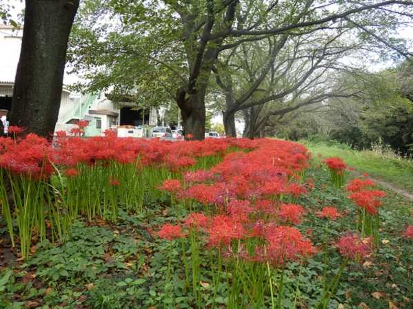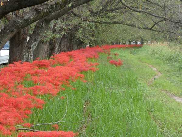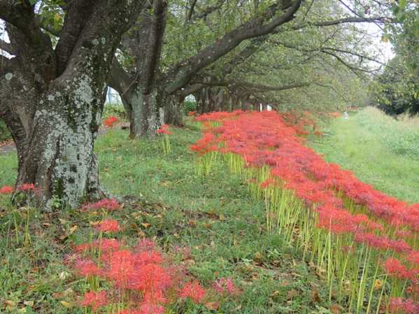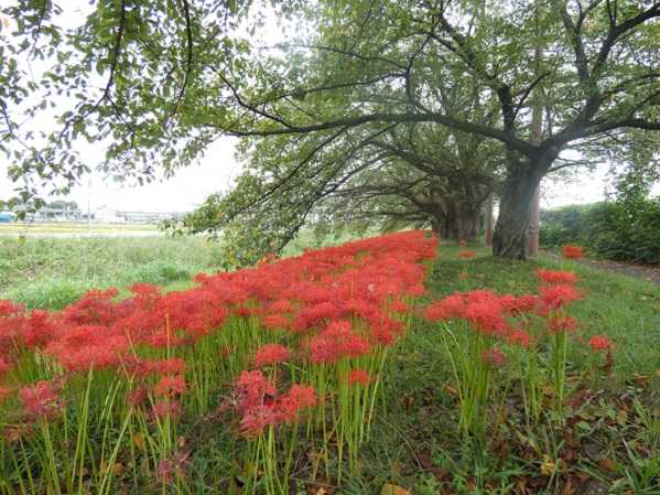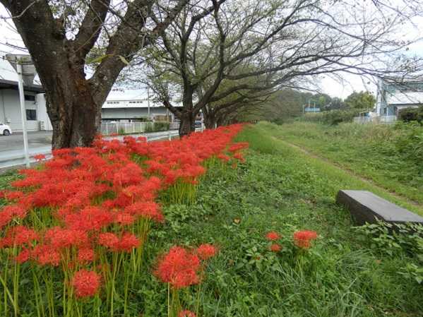 工業団地脇から篠津桜堤まで約1kmの桜並木下に彼岸花の並木がつつきます。9月30日撮影