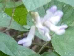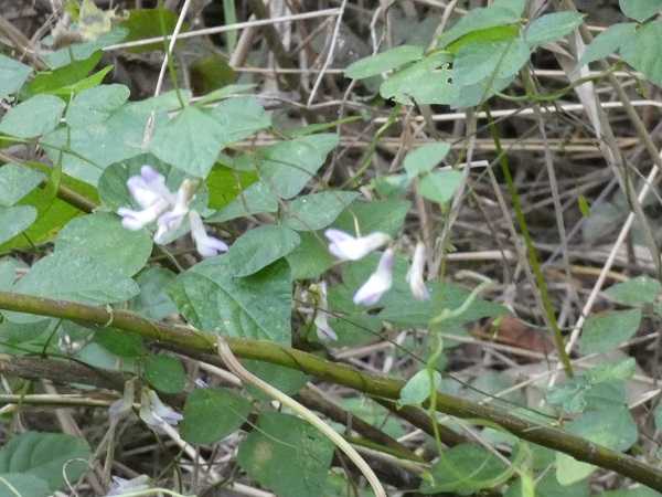 暫く歩いた先には木立やフェンスなど何にでも絡みつくヤブマメ、花が咲きやがてさや状の豆がが付くがまだしばらく先のようだ。10月5日撮影