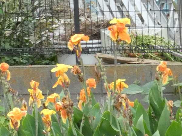 朝日桜通りの川向うにある民家のカンナの群落、黄色から赤く色が変わる種類で色が変わると最後