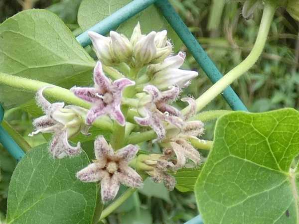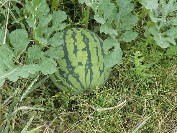 通りすがりの草藪のガガイモの花と捨てた種から生えたスイカが成長していて大きくなっている