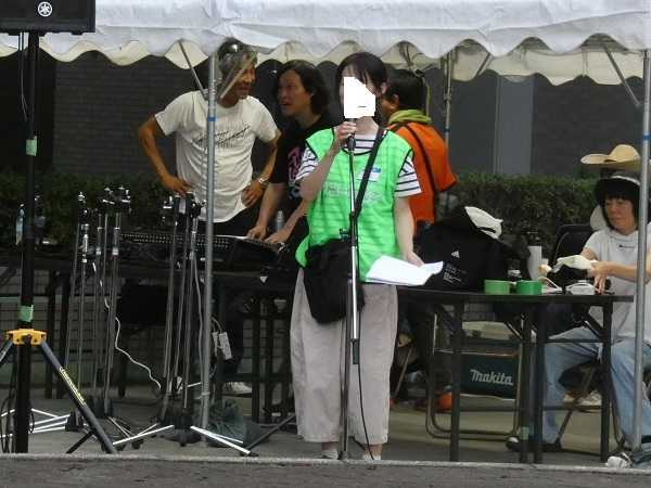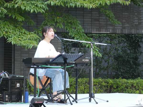 北本親善大使の美根ゆり香さんのステージ。シンガーソングライターであちこちで唄っています 彼女の歌に合わせてステージ下で踊るご婦人もおめかししています(笑い)左側奥がステージでその前から沢山の椅子やテーブルが並べられキッチンカーや出店で購入した物を会食しながらイベントが見れます。8月30日撮影