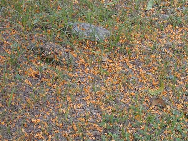 キンモクセイも咲き出し地べたには沢山の花が落ちていて風に乗っていい香りがしてきます通りすがりの草藪のガガイモの花と捨てた種から生えたスイカが成長していて大きくなっている 街路の銀杏並木も色付き始めました。木が若くまだ実をつけなくて紅葉している。10/14撮影