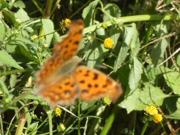 黄色のセンダングサにヒョウモンチョウが密を吸いに来ているが表羽と裏羽が極端に違います裏羽がはっきり写せなかったが表羽はヒョウモンガラで裏羽は黒っぽい筋模様。 10月8日撮影