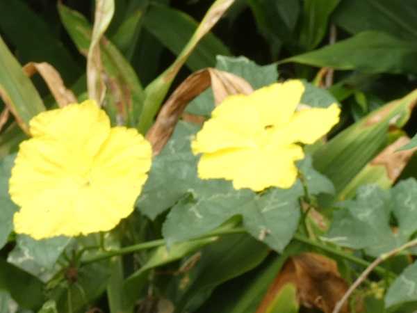 帰り道で黄色の大きな花を見つけ何かと思ったら葉陰にあったヘチマの実を見つけブログネタです民家の屋敷林の中に一株、ヤブミョウガ、脇には野朝顔がブルーの花を咲かせている。9/11撮影