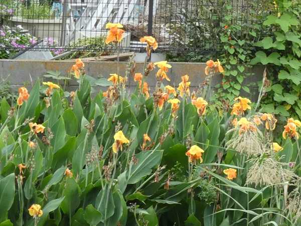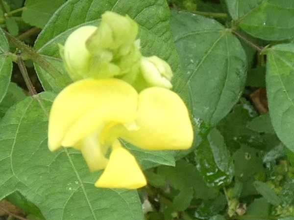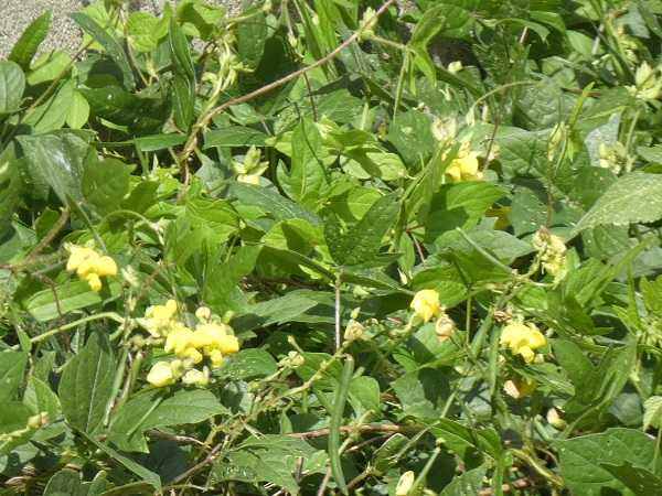 朝日桜通りの川向うにある民家のカンナの群落、黄色から赤く色が変わる種類で色が変わると最後 暫く歩いた先には木立やフェンスなど何にでも絡みつくヤブマメ、花が咲きやがてさや状の豆がが付くがまだしばらく先のようだ。10月5日撮影