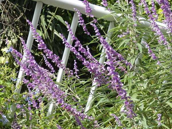 散歩道の美容院のブロック塀の上に咲いていたサルビアレウカンサの白い花びらが目立ってきた総合公園のメタセコイアの林にコサギの群れがくると田んぼの稲刈りが始まります。10/12撮影