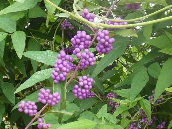 散歩道のわきで見つけたムラサキシキブ、花も同じ色で実りの秋で実をつけている傍の民家の花壇ではインドハマユウのピンクの花と彼岸花の白と赤のコラボ、組み合わせがいいね脇にあった造園業の育成地でつつじが狂い咲きしていた。異常気象で咲き出します。9月28日撮影