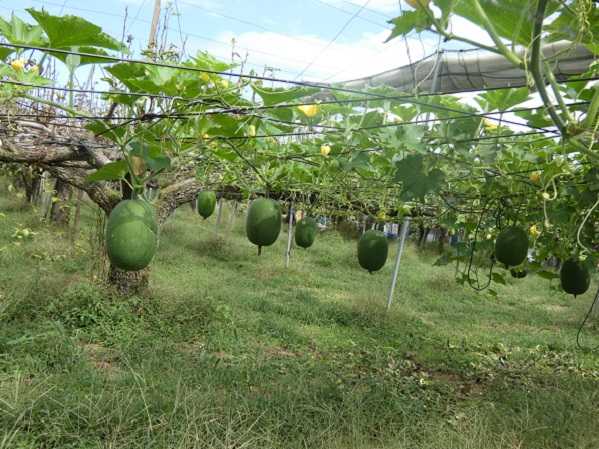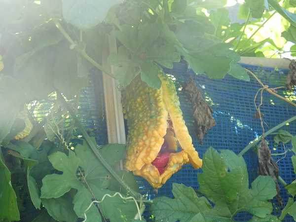 常光地区を散策中です。梨畑の端に植えられたゴーヤが実をつけ黄色に熟れて赤い種が見えている 少し歩くとこっちの民家の庭先にダチュラの花、別名エンゼルストランペットとも呼ばれる隣の木に絡まった大きな花はへちまかな?まだ実がなっていないので同定できません。9/25撮影