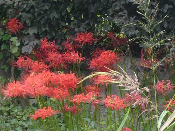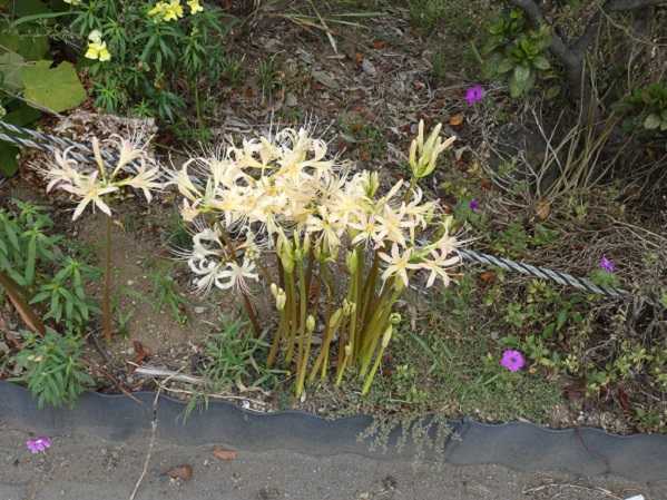 暑さが厳しかったためヒガンバナの開花も遅れたが白い花は開花が赤い花より後でまだ咲いていたここの民家の花好きの奥さんが色んな花を植えていてドイツハマユウのピンクの花が今咲いている。白い花もあるがピンクの方が遅く咲き白いい花は終わっています。10月10日撮影