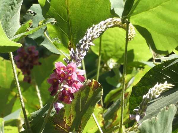 小川の土手のわきの草の中に咲きだしたヤブズルアズキ、小豆の原種と言われています ヨウシュヤマゴボウの花と実、その下にはマルバルコウソウがかわいい花を見せています木立の中に咲いていたヌルデ、ウルシの仲間まで触るとカブレるからご用心ご用心, 9月22日撮影