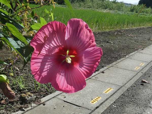 加納地区を散策中に大きな花が咲いているのを見つけゲットです。図鑑でアメリカフヨウと判明花が大きくて20cm以上あり豪華です。ここには2種類の花がありピンクと赤でした。9月21日撮影