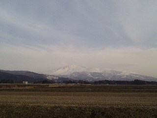 春のやわらかい陽射しのの中の鳥海山 いつもと形が違う 今日は昼から休みでちょっとドライブ