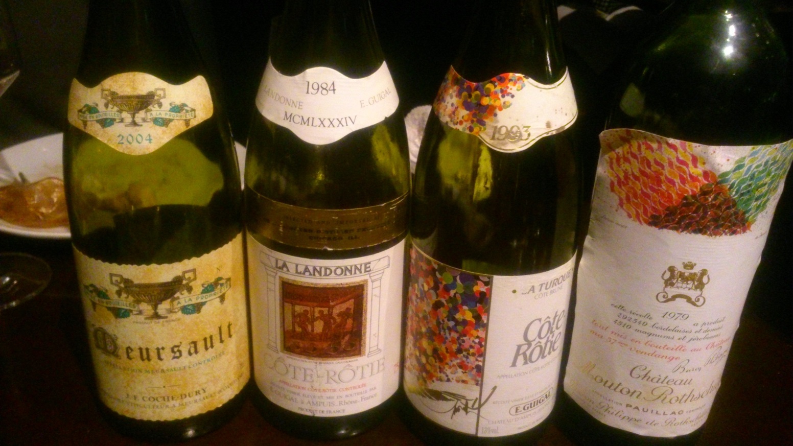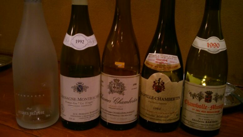 色んなワイン会に出ていたのですが、さっぱりUPできていませんそれでも、今回のワイン会は是非とも記録しておきたい。そう感じる会でした。□Alain Robert / Mesnil Tradition 1986凄くお久し振りのAlain Robert。色は同年代のchampagneにしては薄め。泡も細かく、ちゃんと残っています。熟成香はあるけれど、思ったより若い。繊細でエレガントなのだけれど、ちょっと酒質が弱いか?とも思ったのですが(スイマセン…)後半グングン伸びてきて、ボディも厚くなりました最後まで残しておいてよかったー(笑)□Leonce Bocquet / Montrachet 1979実は僕、悶で悶絶したことがありません。。。で、今回の悶。結論からいうと、もう素晴らしかったです残念なことに、このワインを表現するボキャブラリーは僕にはありません。ただ只管に、美しい。もしかしたら完璧なバランス、というのとも違うのかもしれないけれど、ある方向性では間違いなく完成されたワイン。壊れそうなほど繊細で、高貴で、煌いていて、危ないほどに清潔。其処に在るのに何処か手の届かないもの、それから、逆説的ではあるけれど、既に失われてしまったものを思わせる。僕の望む白の理想系に近いかもしれません。■Geantet Pansiot / Gevrey Chambertin 1er "Poissenot" 1990えーと、僕の持参品なんですけど、あからさまに格が、ねぇ(苦笑)しかしまぁ、なんというか普通に美味しかったです。どなたかも仰っていましたが「これが嫌いなブル好きはいない」という香味。今飲み頃の入り口、多分3年後位からが真の飲み頃では。今回のラインナップでは全く印象に残りませんが、こういうワインが1本あってもいいですよね、ね■Jean Jacques Confuron / Romanee St. Vivant 1992残念なことに、ちょっと紹興酒・お醤油が入っていました。決して飲めないコンディションではないのですが、香が命のRSVとしては、らしさが消えてしまって寂しい限り。紹興酒の下にある液体はグリセリンたっぷりで、しっかりした酒質だっただけに残念■E.Guigal / Cote Rotie La Mouline 1987今年飲んだ赤の中で最大の衝撃色は濃いながら透明感のある紫で、かなり艶が。香は目を閉じれば熟成したシャルドネの如く、味わいは透明感とエレガンスに溢れ、色々な要素が綺麗に昇華し、調和しています。ワインというのは本当に深いです。その恐ろしいほどに深いワインの世界にあって、間違いなく深淵にある1本。■Thomas Bassot / Clos de la Griottes Chambertin 1969 "Clos de la Griottes Chambertin" は普通"Griottes Chambertin"と表記すると思うのだけれど。どうもThomas Bassotはこう表記しているみたいですね。さて、このワイン。立ち上がりは古酒にありがちなように、ちょっとふらふらしていましたが次第に綺麗にまとまって、非常に69的な美味しいワインになりました。僕は69のワインが好きで、幸いなことにそこそこ本数も飲めていますけれど、グリオットは初めて。ちょっとグリオットっぽさも感じた気がするけれども、気のせいかも(笑)。グリオットの古酒って余り経験がないもので…。兎に角、古酒の妙が詰まった素敵ワインでした---参加者のみっき様、ラの親分、くまあざらしさん、本当にありがとうございました。僕なんかが参加できるレベルではないワイン会で、恐縮しきりだったのですが非常に勉強になりました。ワインが好きで、ワインにどっぷり漬かっている(=マニアw)な方々と話すのは至福ですね♪