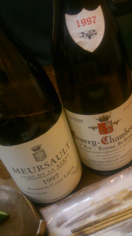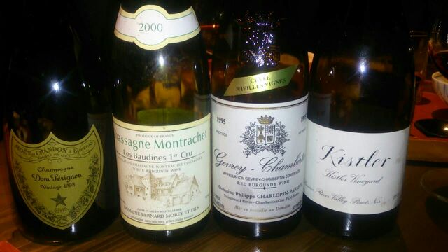 一般の友達との飲み会を持ち込みで。 ・ドンペリ98 ・ベルナールモレ 1er 00 ・パリゾ ジュヴレイ95 ・キスラー キスラーヴィンヤード01 分かりやすさメインでセレクト。 ドンペリは掴み。狙い撃ちどおりのマロン。 Bモレは個性があまりなく、ソリッドな仕上がりで和食に合う。 パリゾは先日飲んだ90のシャルムが素晴らしかったので2匹目の鯲狙いも成功。 もわっとした、きれいに熟度したブル赤の美点がよく出てました。 キスラーも薔薇の香りがすると好評でした。 まぁキスラーとか酷評されることが多いですが、自分にワインを評するに足る経験があるか、よく考えて欲しいと思います(笑) 経験値は最低条件ですよ、と。