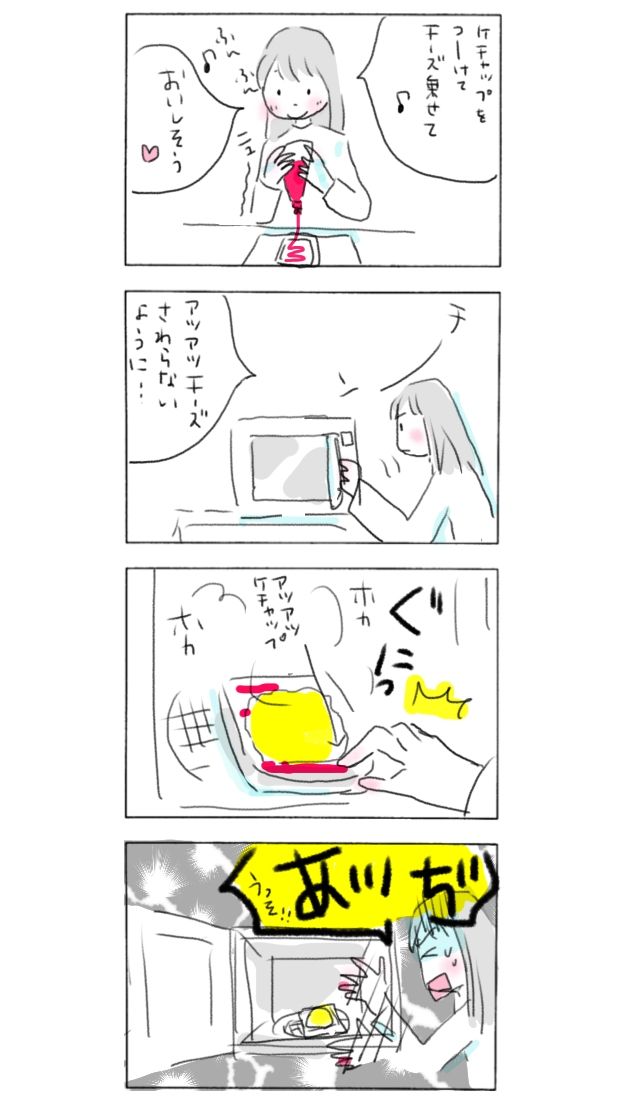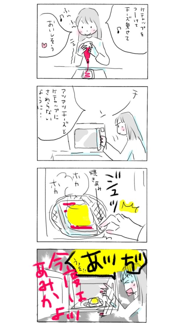 あつあつチーズに気をつけて。あつあつケチャップも気をつけて。なのにまさかの焼きあみにやられるという…ん〜…スリリング!#今日もいい日でした #イラスト #イラストレーション #4コマ漫画 #まんが #イラストエッセイ #コミックエッセイ #コミック #エッセイ絵日記 #日常漫画 #エッセイマンガ #暮らし #暮らしを楽しむ #イラストレーター #無印良品 #暮らしの記録 #あるある #朝食