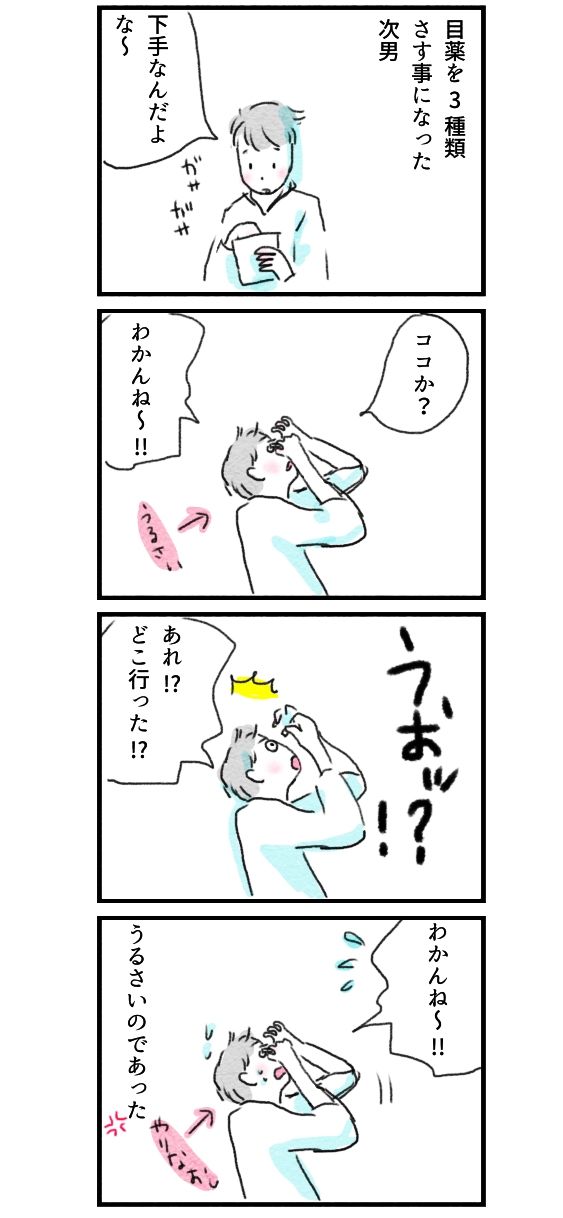 ただ、単に目薬さすだけでもこのうるさささすがヘナチョコ次男坊#今日もいい日でした #イラスト #イラストレーション #4コマ漫画#まんが #イラストエッセイ #コミックエッセイ #コミック #日常漫画 #暮らし #イラストレーター #あるある #男子 #男子高校生 #dk #ママ #男の子ママ