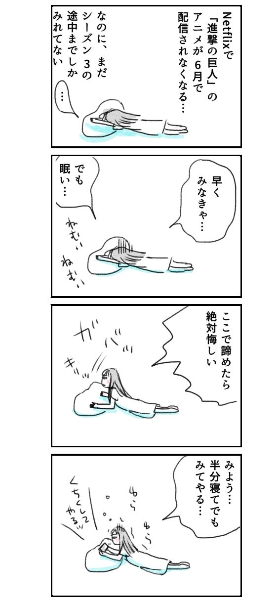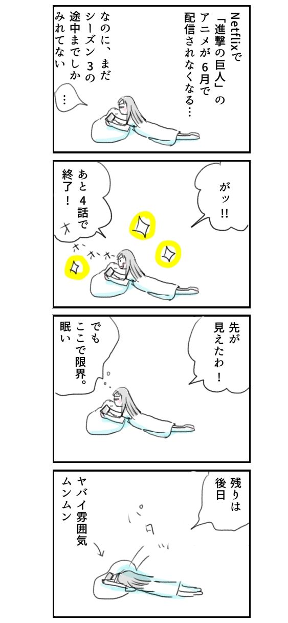 Netflixでみ始めたんだけど、アニメ版「進撃の巨人」…6月いっぱいまでの配信だそう。シーズン3まで大急ぎでみなきゃ!★お仕事アーバンライフメトロでマンガが配信されました。今回は、超低空飛行で突進してきたツバメさんのお話です。制作インタビューも載っていますので、是非ご覧ください😀こちらから今回はママ友達とのLINEのお話はこちら。長い自粛生活でストレス爆発です!こちらから★イラストを担当しました。すずちゃんのはじめてのカメラとレンズ (上達やくそくBOOK) [ 鈴木知子(カメラ) ]価格:1760円(税込、送料無料) (2020/5/12時点)楽天で購入すずちゃんの理解して学ぶカメラとレンズ (上達やくそくBOOK) [ 鈴木知子(カメラ) ]価格:1760円(税込、送料無料) (2020/5/12時点)楽天で購入#今日もいい日でした #イラスト #イラストレーション #4コマ漫画 #まんが #イラストエッセイ #コミックエッセイ #コミック #日常漫画 #エッセイマンガ #暮らし #暮らしを楽しむ #イラストレーター #あるある #アーバンライフメトロ #お仕事情報 こちらから