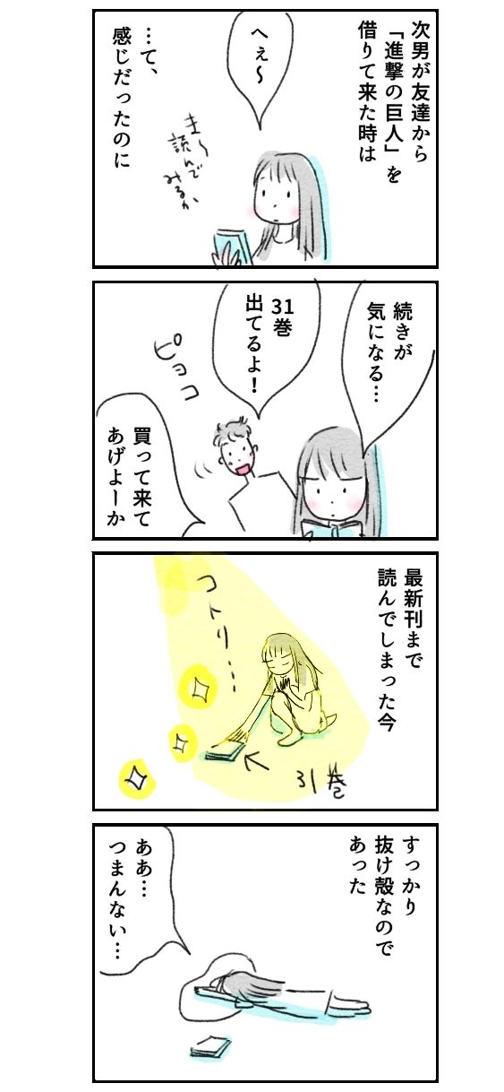 今から観ます!進撃の巨人(31) (講談社コミックス) [ 諫山 創 ]価格:495円(税込、送料無料) (2020/6/26時点)楽天で購入★お仕事情報アーバンライフメトロでマンガが配信されました。今回は、超低空飛行で突進してきたツバメさんのお話です。制作インタビューも載っていますので、是非ご覧ください😀こちらから今回はママ友達とのLINEのお話はこちら。長い自粛生活でストレス爆発です!こちらから★イラストを担当しました。すずちゃんのはじめてのカメラとレンズ (上達やくそくBOOK) [ 鈴木知子(カメラ) ]価格:1760円(税込、送料無料) (2020/5/12時点)楽天で購入すずちゃんの理解して学ぶカメラとレンズ (上達やくそくBOOK) [ 鈴木知子(カメラ) ]価格:1760円(税込、送料無料) (2020/5/12時点)楽天で購入#今日もいい日でした #イラスト #イラストレーション #4コマ漫画 #まんが #イラストエッセイ #コミックエッセイ #コミック #日常漫画 #エッセイマンガ #暮らし #暮らしを楽しむ #イラストレーター #あるある #アーバンライフメトロ #お仕事情報