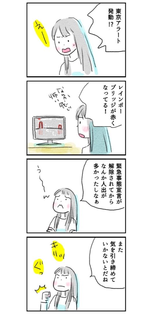 やっと日常に向けて動き出したんだもん。また後戻りしない様に、今、自分に出来ることをする!真っ赤なレインボーブリッジに自粛を違う #今日もいい日でした #イラスト #イラストレーション #4コマ漫画 #まんが #イラストエッセイ #コミックエッセイ #コミック #日常漫画 #エッセイマンガ #暮らし #暮らしを楽しむ #イラストレーター #note #いま私にできること