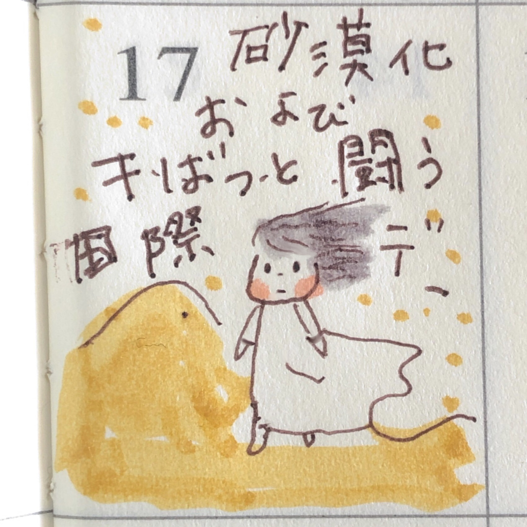 今日は「砂漠化および干ばつと闘う国際デー」地球を守るために、今自分にできることは何だろう?と考えるきっかけになります。ちょっとしたことでも。#今日は何の日 #砂漠化および干ばつと闘う国際デー #イラストレーター #イラスト #手帳 #手帳好き #手帳の中身 #手帳タイム #手帳時間 #日記 #絵日記 #トラベラーズノート #トラベラーズノートレギュラーサイズ #サラサ #マイルドライナー #スタビロ